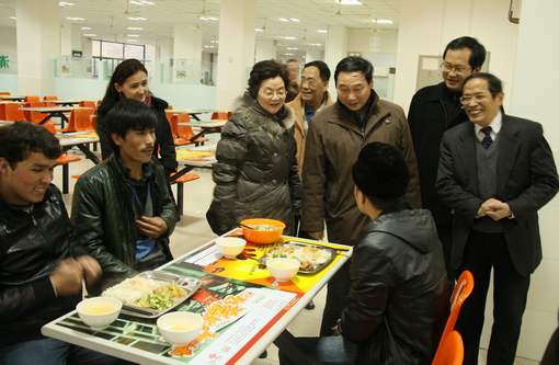 2月24日下午市教卫党委副书记、市教委副主任高德毅,市教卫党委副秘书长曹荣瑞,市民办高校党工委书记杨月民,市教委民办教育管理处副处长何鹏程,市教委督导专员许一昌一行在春寒料峭中来到我校调研,高书记他们一下车在项校长和赵书记的陪同下来到新疆籍同学住的三号宿舍看望了新疆籍学生。一进房间他就与同学亲切握手交谈,问寒问暖,他仔细看了学生的床铺、生活用品,叮嘱同学认真完成学业,不要辜负政府的期望。在清真食堂,高书记边参观边询问了菜价,菜的口味,食堂营业时间,厨师的身体情况等等,他指出学校清真食堂要尊重少数民族风俗习惯,要执行党的政策,保证学生生活质量,高书记一行对学校做好新疆学生的工作表示十分满意。
