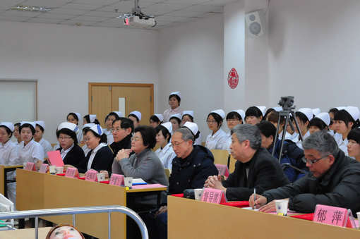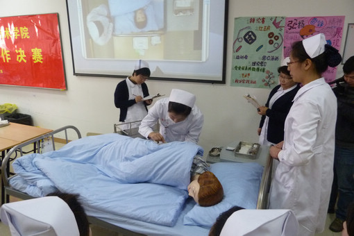 按赛程设计,每个项目有4位选手,分2组竞技。主持人龚懿宣布比赛开始,整个赛场顿时鸦雀无声。第一个项目无菌技术:从穿脱无菌手套,到铺无菌板,选手们整个过程一丝不苟,动作麻利,可是仍能从她们紧锁的眉头,专注的神情中感受到她们紧张的状态,评委们和观摩的老师同学看着他们如行云流水熟练的动作,都露出了赞赏的目光;第二个项目:肌内注射,几位选手在为病床拉隔离幕帘等需口述的环节中,声音过小,细心的赵佩琪书记赛后关切地提醒保护病人隐私的重要性;第三个项目:铺备用床,这是临床护理操作中最费体力的项目之一,选手们虽然身材娇小,但技艺娴熟,体力充沛,整个操作过程非常完美,赢得了大家阵阵赞许。中午时分,首届护理技能操作大赛圆满结束,学校领导即兴上台讲话,随后为大赛优胜者们颁奖,并与参赛者和评委们合影留念。