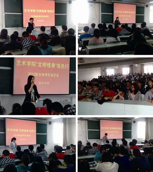 为配合学校开展创建市级特色高职院校,市示范性民办高校、上海市文明单位三大重要任务和党委工作要求:按不同年级实施分类教育。艺术学院于10月25日召开了“文明修身我先行”2012级全体学生动员会。